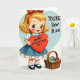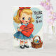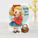 This greeting card shows a sweet, wide-eyed girl with bright blue eyes and rosy cheeks, looking straight at you with a gentle smile. Her golden curly hair is pulled back with a red bow, and she holds a big red heart close to her chest. She’s wearing a blue pinafore over a white blouse, with a ruffled skirt trimmed with tiny red hearts, plus classic Mary Jane shoes. On the red heart, the message “HAPPY VALENTINE’S DAY” appears in clear, easy-to-read lettering. To her right, a light blue heart shape holds the words “YOU’RE Sew Nice” in dark lettering, and it sits near a small woven basket filled with thread spools in green, yellow, blue, and red. The whole scene feels warm and friendly, like a simple throwback Valentine meant to make someone feel cared for ❤️💌🍫. Hope you’ll use it to share kind feelings and a little love this Valentine’s Day.