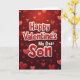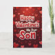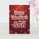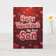 This Valentine's Day card features a deep red background that fades into a darker burgundy near the bottom. In the center, large glossy red letters outlined in white spell out “Happy Valentine’s My Dear Son,” making the message the first thing you notice. The lettering has a rounded, slightly 3D look, like shiny candy, and it stands out strongly against the darker backdrop. All around the words, hearts float in different sizes, with some sharp and bright and others softly faded into the background. The overall scene feels gentle and loving, like a quiet reminder that your son is always on your mind. It’s a meaningful card to give because it says “I love you” in a straightforward way, without needing a long note. 🥰❤️ Hope it helps you share Valentine’s Day sentiments with someone you care about.