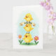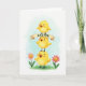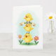 The front design shows three round, sunshine-yellow birds stacked vertically, each with rosy cheeks, dark shiny eyes, and wide smiles that make them look like close friends leaning on one another. The bottom two form a steady base while the top bird perches lightly, giving the pile a cozy, affectionate feel like a shared laugh. A parchment-toned banner unfurls across the middle, and a short greeting appears in green lettering centered on the banner. Behind them, the background fades into a soft wash of cerulean and aqua, like a calm spring sky with plenty of open space. At the bottom, a strip of bright green grass grounds the scene, adding a fresh seasonal touch 🌷. On either side of the grass stand two pink flowers with simple faces, their small smiles angled toward the birds as if joining in the moment 🐰. Tiny shading along the birds’ rounded edges and the banner’s curled ends adds depth against the airy blue backdrop.