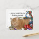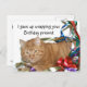 Frustrerad orange tabby katt fastnade i rosett band födelsedag. Fronttexten "Jag gav upp och täckte din present". Bakåttext "Här är ditt kort". Lämplig för alla åldrar. Text kan ändras eller tas bort med knappen CUSTOMIZE