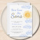 Familjen inbjudan och vänner till din sol-temade vännpojkars babydusch med denna söta inbjudan. Texten "Här Kom The Sons" i snyggt blå typografi med gult vattenfärg sol och moln. Enkelt anpassade. Ursprunglig vattenfärg © Michele Davies.