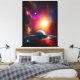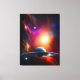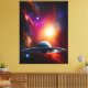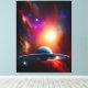 En fantastisk UFO som flyger genom ett lysande himlar fyllt med vibrerande färg och stjärnor.