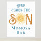 Den här Momosa Pub Baby Shower-signalen har en gult vattenfärg som lekar sol och snyggt-skripttypografi. Ursprunglig vattenfärg © Michele Davies.