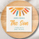 Den här sol-temade babyduschnapkin dekoreras med en färgstark sol och snyggt typografi på en gräddbakgrund. Texten är anpassade. Ursprunglig vattenfärg © Michele Davies.