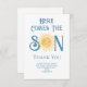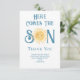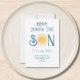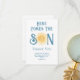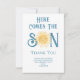Den här söta pojkens babydusch tack vare ditt kort innehåller texten "hit kommer sonen" i blå retrotypografi med en leende gult vattenfärg sol. Enkelt anpassade. Ursprunglig vattenfärg © Michele Davies.