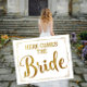 Här kommer briden bröllop-skylten guld fototryck
