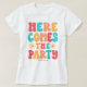 Gör plats för den groovy bröllopsfesten med vår roliga 'Här kommer bruden' anpassade t-shirt-design! Denna retroinspirerade design har en färgexplosion och nyckfull typografi som tar dig tillbaka till den groovy eran. Perfekt för möhippor, brudshower eller bara för att fira det förestående bröllopet med stil.