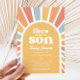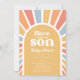 Här kommer inbjudan till Son Baby Shower - retro boho sol i gult, orange och blått färg för pojke på vägen! Anpassa med din händelseinformation... "Här kommer sonen Baby Shower" är inte redigerbart. Bakgrundsdesign omfattar "Sonshine on the horizon"