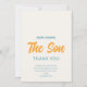 Tack till familj och vänner för deras barnduschgåvor med denna söta solskenspojksdusch tack vare ditt kort. Texten "Här kommer sonen" i typografin snyggt med en färgad vattenfärg sol på en mjuk gräddbakgrund. Baksidan är dekorerad med sol mönster. Enkelt anpassade. Ursprunglig vattenfärg © Michele Davies.