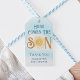 Den här söta pojkens märkre för babyduschgåva innehåller texten "Här kommer sonen" i retrotypografi med en leende gult vattenfärg sol och blå himmel. Enkelt anpassade. Eftersom vi skapar vår teckning kommer du inte att hitta just den här bilden från andra designers. Ursprunglig vattenfärg © Michele Davies.