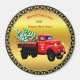 Här kommer Santa's Julgran farm lastbil. Med tre träd och ett regn hjort i bakre delen av det röda stora lastbil med tomten tittar över fordon:s centrum
