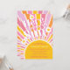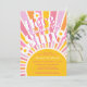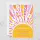 Planerar du en flickdusch? Den här färgstarka sol-temade babyduschinbjudan innehåller "Här kommer Sol" i retrotypografi på solnedgången med vita daisy. Enkelt anpassade.