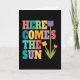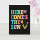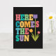 Färgdesign med texten "HERE COMES THE SOL" och en vår-blomma.