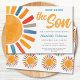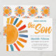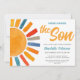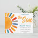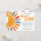 Familjen inbjudan och vänner till din sol-temade babydusch med den här söta solskenspojkarnas babyduschinbjudan. Texten "Här kommer sonen" i typografin snyggt med färgämnet sol. Baksidan är dekorerad med sol mönster. Enkelt anpassade. Ursprunglig vattenfärg © Michele Davies.