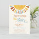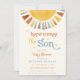 Den här beundransvärda inbjudan innehåller en vattenfärg sol, som ställs in mot en vit bakgrund med mjuk vintage. Den nedsänkta färgen av gult, orange och blått i kombination med retroteckensnittet ger en charmerande 70-årskänsla. Fullständigt anpassade med dina detaljer är denna inbjudan perfekt att välkomna din lilla solstråle.