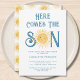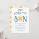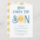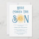 Familjen inbjudan och vänner till din sol-temade babydusch med den här söta solskenspojkarnas babyduschinbjudan. Texten "Här kommer sonen" i snyggtens blå typografi med gulten vattenfärg sol. Baksidan är dekorerad med ett leende sol mönster. Enkelt anpassade. Ursprunglig vattenfärg © Michele Davies.