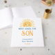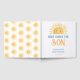 Denna baby shower-gästbok har texten "Här Kommer Sonen" i stilfull typografi med en söt gul akvarellsol.
