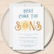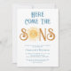 Familjen inbjudan och vänner till din sol-temade twin-barndusch med denna söta solskensinbjudning. Texten "Här Kom The Sons" finns i blå retrotypografi med en söt gult vattenfärg sol. Enkelt anpassade. Ursprunglig vattenfärg © Michele Davies.
