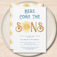Familjen inbjudan och vänner till din sol-temade twin-barndusch med denna söta solskensinbjudning. Texten "Här Kom The Sons" finns i blå retrotypografi med en söt gult vattenfärg sol. Baksidan är dekorerad med ett leende sol mönster. Enkelt anpassade. Ursprunglig vattenfärg © Michele Davies.