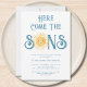 Familjen inbjudan och vänner till din sol-temade twin-barndusch med den här söta solskenspojkens barnduschinbjudan. Texten "Här Kom Sons" i snyggt blå typografi med gult vattenfärg sol. Enkelt anpassade. Ursprunglig vattenfärg © Michele Davies.