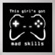 Illustration av spelstyrenheten med "Den här flickans har-galna färdigheter". Visa upp din passion för spel! Den här bilden skapades av en spelspelare. Teckensnitt OCR-A som används i den här konstruktionen. Knappen Anpassa använda om du vill lägga till ett namn eller meddelande. Även bakgrunden färg kan ändras - anpassa den > redigera