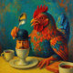 Hårdkokt människa - Fowl Play på Breakfast. En surrealistisk, otålig twist på frukosten bord, där en flambotande kyckling förvandlar bord på mänskligheten. I en värld som är besatt av kontroll påminner denna bild oss humoristiskt om att naturen i tysthet upprätthåller, härjar och i slutändan överträffar våra försök till dominans. Det är en djärv, färgstark balansering av biet med en allvarlig reflektion över vårt ställe i den naturliga ordningen.