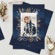 Vår stjärngula juvel-abstrakt vinterkvällens julsamling fångar upp ett royal med en modern abstrakt vrid. Djupa marinblåsor, gyllene och blå juveler och blåblå nyanser skapar en elegant vinter nattambians. Konstruktionen har fjädrar från flotta och guld, marinblå och guld renar, grenar med juvelaccent och blad i elegantens utandningsform. Anpassa fotojulkortet med ditt foto, namnteckning i familjen och år. Alla illustrationer är handritade originalbilder av Moodthology Papery.