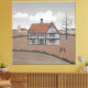 Colourful artwork of an old medieval house in the English countryside, with an old church in the background, and a couple of hares boxing in the foreground. Perfect for anyone who loves folk art.