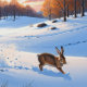 I denna pittoreska scen springer en majestätisk hare över ett snölastat fält i det mjuka vinterljuset. Denna stiliserade akvarellbild fångar den otämjda skönheten i naturen och inbjuder dig att omfamna den lugna och livliga vinterskogen.