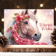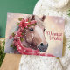 Skicka varma höst- och julhälsningar med detta vackra kort med en charmig häst som bär en festlig krans och halsduk, mot en snöig bakgrund. Meddelandet "Varmaste önskningar" tillför en mysig och hjärtlig touch, vilket gör det till det perfekta kortet för djurälskare och hästentusiaster.