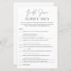 Svar Nyckel: #1) 5 poäng: Lily, 4 poäng: Calla Lily, 3 poäng: Daisy, 2 poäng: Carnation, 1 poäng: Orchid #2) 5 poäng: 25, 4 poäng: 26, 3 poäng: 30, 2 poäng: 23, 1 poäng: 28 #3) 5 poäng: 3, 4 poäng: 4, 3 poäng: 5, 2 poäng: 6, 1 poäng: 2 #4) 5 poäng: Stranden, 4 poäng: A park, 3 poäng: A trädgård, 2 poäng: Utomhus/utsida, 1 poäng: Hotel #5) 5 poäng: Hawaii, 4 poäng: Bahamas, 3 poäng: Karibien, 2 poäng: Jamaica, 1 poäng: Niagara Falls #6) 5 poäng: 8, 4 poäng: 6, 3 poäng: 4, 2 poäng: 12, 1, 1, 1, 1 poäng: 1, 1, 1, 1, 1 poäng: 1, 1, 1, 1, 1, 1, 1: 3 #7) 5 poäng: Toaster, 4 poäng: Blender, 3 poäng: Mixer, 2 poäng: Coffee Maker, 1 poäng: Can opener #8) 5 poäng: Kiss, 4 poäng: Dance, 3 poäng: Vows, 2 points: Coffee Maker, 1 poäng: Exchange ringar #9) 5 poäng: 10, 4 poäng: 8, 3 poäng: 9, 2 poäng: 7, 1 poäng: 1 poäng: 1: 1: 1 2 #10) 5 poäng: Rosa, 4 poäng: Blå, 3 poäng: Röd, 2 poäng: Lila, 1 poäng: Vit