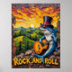 Denna fantastiska målning visar en haj, försedd med solglasögon från top hat och coola, och släpper ut en "solnedgång" på en elektrisk gitarr från ett bergigt toppmöte. Scenen breder ut sig över den rullande grönten backe och träd, som bantas i det varma, texturerade ljuset av ett inställt sol. Det sjudande, impasto-penselverket skapar en kraftfull och vismisk atmosfär och firar "Rock and roll"-andan i en unik naturmiljö.