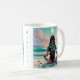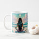 Vackra ai-konst som skildrar en underbar kvinna som på stranden mediterade med pina och blå moln, havsyta vinkarare, vit sand och havsglas.