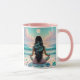 Vackra ai-konst som skildrar en underbar kvinna som på stranden mediterade med pina och blå moln, havsyta vinkarare, vit sand och havsglas.