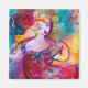 Färgrik, konstnärlig nyckfull, abstrakt figurativ samtida akvarellmålning med tre spelarföremål, blomsterkransar, rosor, blommor, guldgnist, silverfolie i livfulla gula, röda gröna, blå, rosa fuchsia färger .