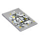 Kolla in denna geometriskt utformade Dödsrelik-symbol, omgiven av grå, gula och blå trianglar.