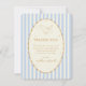 Thank your baby shower guests with this charming Harry Potter Hedwig baby shower design. Featuring Hedwig gracefully soaring above an elegant oval frame, this sweet and magical layout is set against soft blue and white vertical stripes for a classic boy baby shower look. Delicate gold accents and subtle star details add a whimsical, enchanted touch inspired by the Wizarding World.
