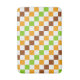 A vibrant checkered pattern of alternating green, orange, and brown squares on a white background. The design creates a lively, geometric feel.