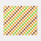 A vibrant checkered pattern of alternating green, orange, and brown squares on a white background. The design creates a lively, geometric feel.