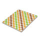A vibrant checkered pattern of alternating green, orange, and brown squares on a white background. The design creates a lively, geometric feel.