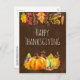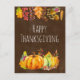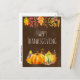 Ett vykort i happy thanksgiving med en vattenfärgad illustration av pumpor, akorns, svamp och säsong höst löv. En gräns utmed överkanten består också av höst löv, bär, akvarier och annat löv. Brun vattenfärgsbakgrund. På baksidan finns ett meddelande som du kan anpassa, såväl som personligen namn och returadressen.