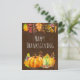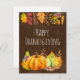 Ett helgdag-kort i Happy thanksgiving med en vattenfärgad illustration av pumpor, akorner, svampar och höst löv i säsong. En gräns utmed överkanten består också av höst löv, bär, akvarier och annat löv.