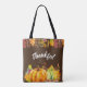 En skuldersäck som säger "Tack". Designad med en vattenfärgad illustration av pumpor, akorner, svamp och säsong höst löv. En gräns utmed överkanten består också av höst löv, bär, akvarier och annat löv. Mörkens bruna vattenfärgsbakgrund.