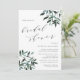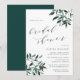 Rustic elegant inbjudningskort för möhippan-inbjudan innehåller rik off-black-lettering i chic block och kursiv stil med calligrafaccenter, med sprejning av vattenfärgsblad i hörnen i rik av grönt som sträcker sig från säd till skog och jägare. Inbjudningskort för möhippa går tillbaka till fast mörk grönt.