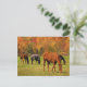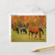 Detta vykort visar brans konstfotografi av ett vackert landskap på landsbygden där hästar betar grönt gräs. Ett backe ligger bakom dem i gloriöst fall, blad färg av rött, orange, guld, gult, brun och grönt.