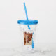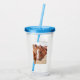 Två hästar, en hingst och en sto, står sida vid sida i en utomhusmiljö. Hingsten är en lever- eller fuxfärgad mustanghäst med en full, brun man och en vit nos. Stoet är mestadels vit med några bruna fläckar och en kortare man. Hästarna står på marken, hingsten något före stoet. Hingsten tittar framåt medan stoet har huvudet vänt åt sidan. Hingstens öron är resta medan stoets är något sänkta. Båda hästarna har ögonen öppna och tittar ut i fjärran.
