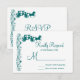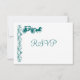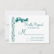 Ett svarskort för landsbyggsbröllop OSA med en häst- och bärutformning med elegant vintage blommor och viner som florerar längs i akvblått färg på vit bakgrund. Dessa är designade för att matcha dessa inbjudningar till häst och bugggiga bröllop i land: