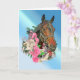Ett hästhuvud av en fux är inramat av en hästsko och rosa och vita rosor mot en blå bakgrund på detta födelsedags kort. Perfekt för alla som älskar hästar!