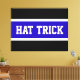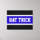Den här sporthockeydesignen har atletisk "HAT TRICK" inuti royalets blå och vita mittpunkt rand mot svart bakgrund.