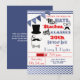 Denna moderna och trendiga hipster blå och vit ombre-stil chevronrandiga födelsedagsinbjudan har vintageinspirerade typsnitt med texten "Du är inbjuden till Hattar, Mustascher och Glasögon 30-årsfesten för..." på den. Det finns en topp hatt med en mustasch i handtagsstil, monokel och slips, med en annan stil mustasch och glasögon på den. Det finns också en vintageinspirerad röd arm med pekande finger till tidpunkten för evenemanget och några blå flaggor. Det finns många textfält för mallar som du kan anpassa med dina festdetaljer eller ta bort vad du inte behöver. Papperssorten är helt anpassningsbar. Om du behöver hjälp med att passa din information, vänligen e-posta niteowlstudio@gmail.com med din förfrågan. Om du behöver hjälp med denna inbjud